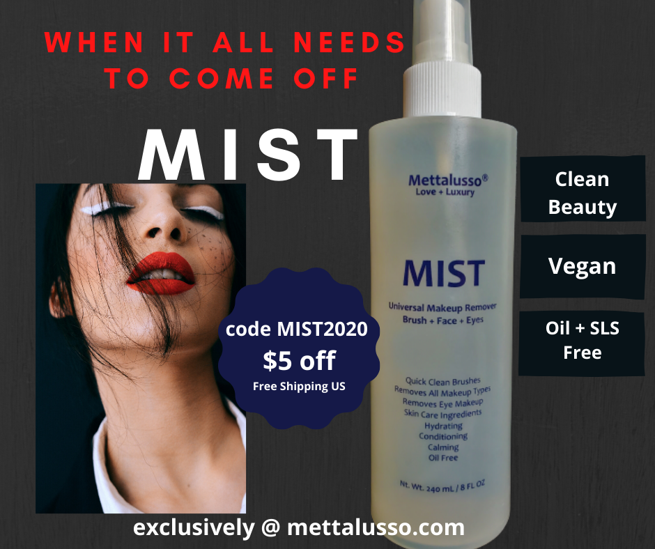 Vegan Clean Beauty. Universal Makeup Remover. Spray Cleanser-nothing like it. Use on Eyes + Face + Brushes + Masks! Free Shipping Always in The US. At http://www.mettalusso.com enter code LOVE for $5 off your order.