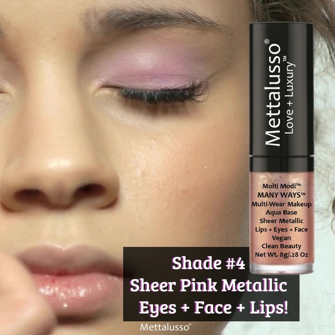 MANY WAYS Makeup by Mettalusso comes in 7 sheer metallic shades you can use on your eyes + face + lips. Molti Modi means “Many Ways” in Italian. Vegan! Mettalusso vegan makeup is luxury and glam. Featuring Shade #4- a gorgeous pink for all skin tones. This water based formula can be layered with other product for endless options in shade building and texture effects. Dries super fast. Soothing cool sensation. Long wear.EU compliant clean beauty ingredients. Free Shipping in the US. Enter code ‘Love’ for $5 off.