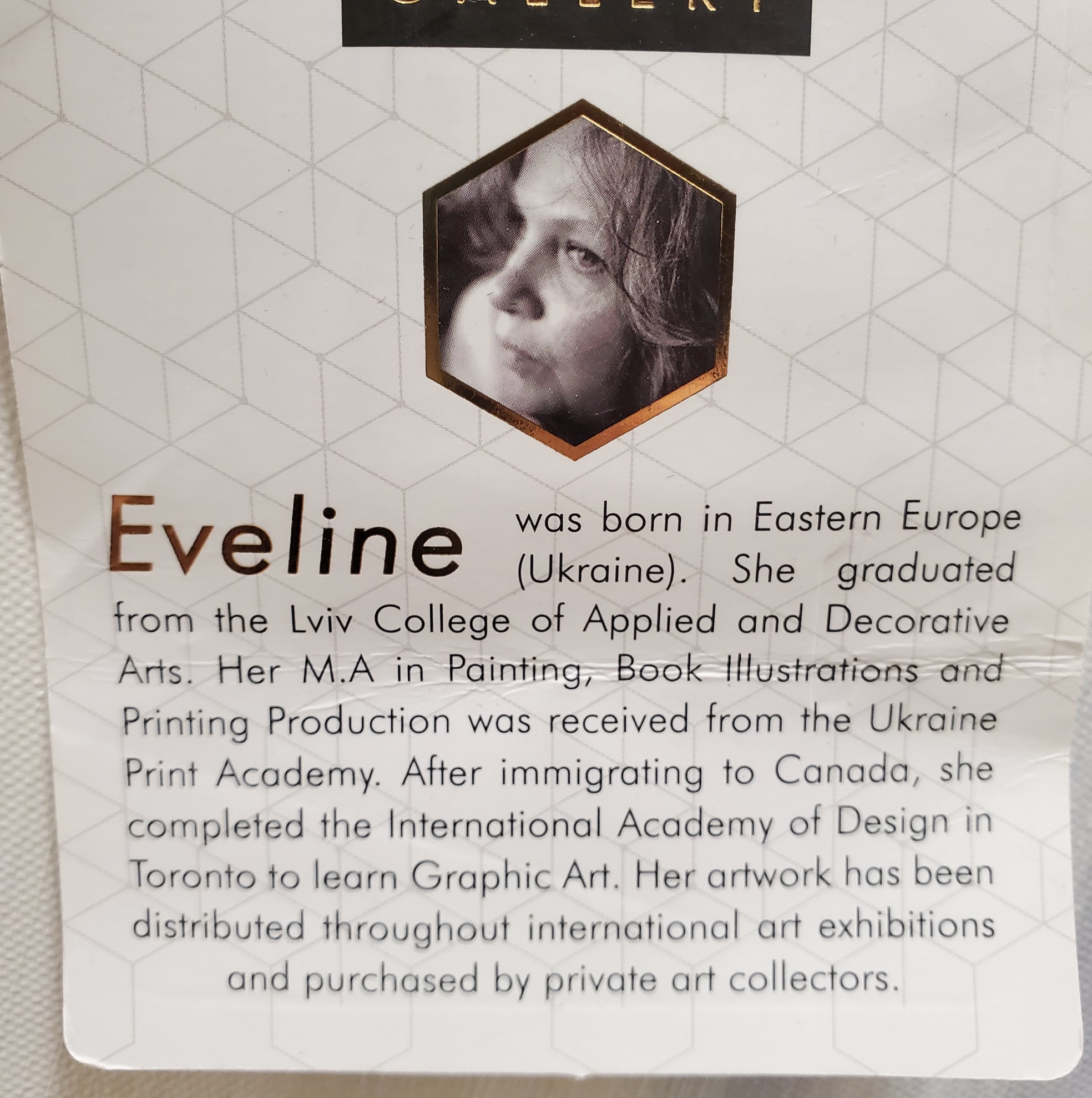 The hangtag shared her bio. Eveline is Ukranian. It says she immigrated to Canada.